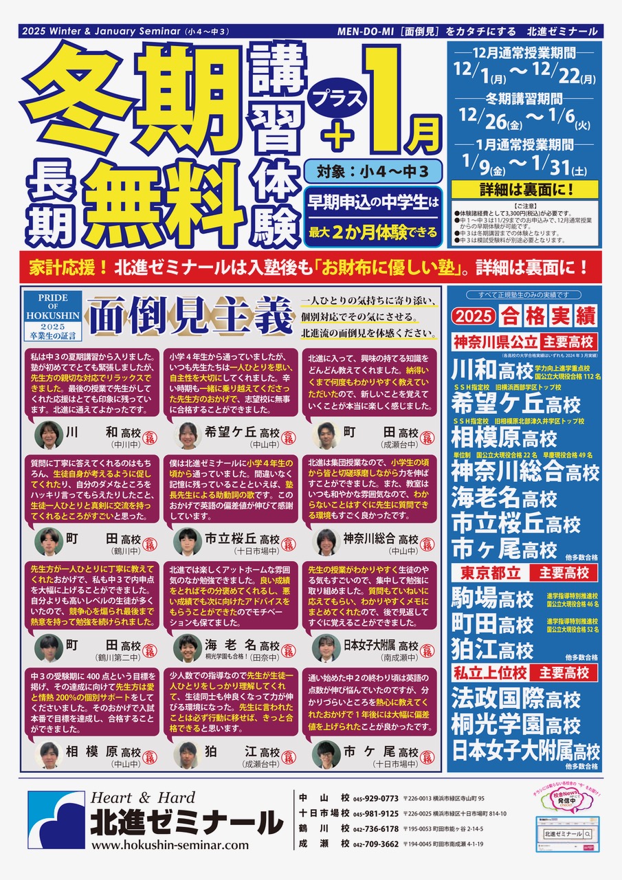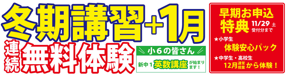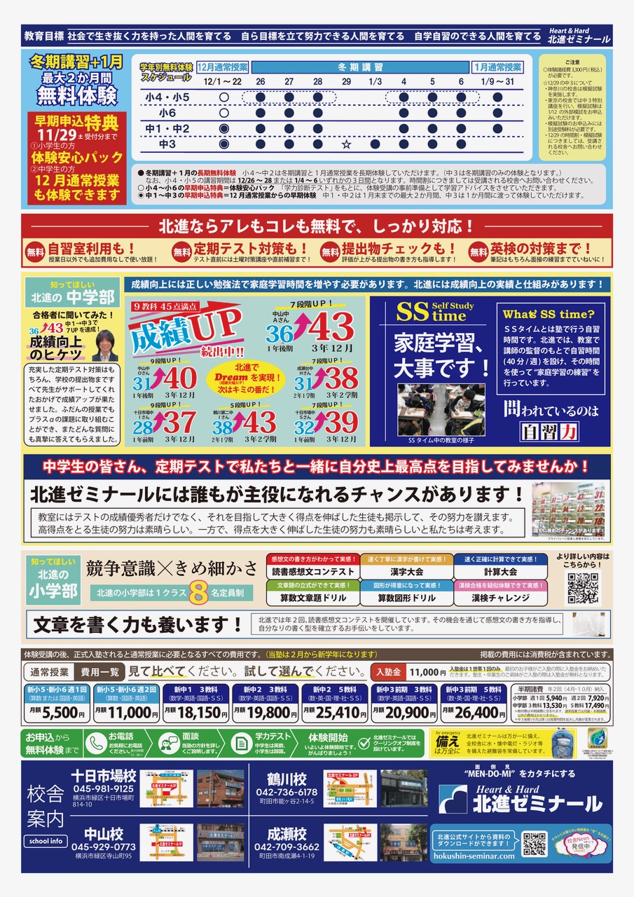 今年の冬の北進は長期無料体験!冬期講習+1月通常授業をセットで無料体験できます。さらに、11/30までのお申込みなら特典がございます!チラシはクリックしてご覧下さい!