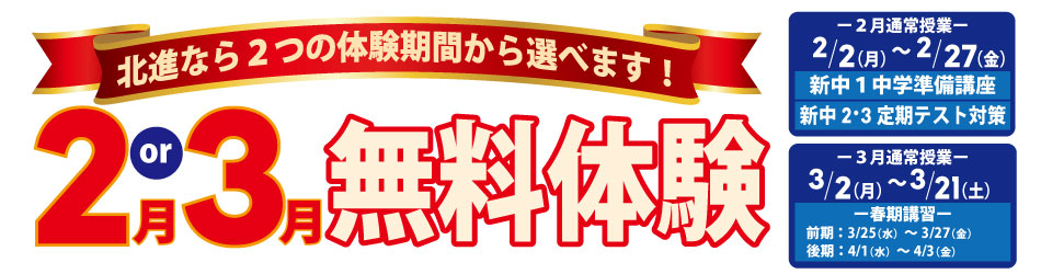 一足早く新年度スタート!中学生は定期テスト対策講座も無料体験できます。キリ良く始められるこの機会はチャンスです!お早めのお申し込みをお勧めいたします!チラシはクリックしてご覧下さい!